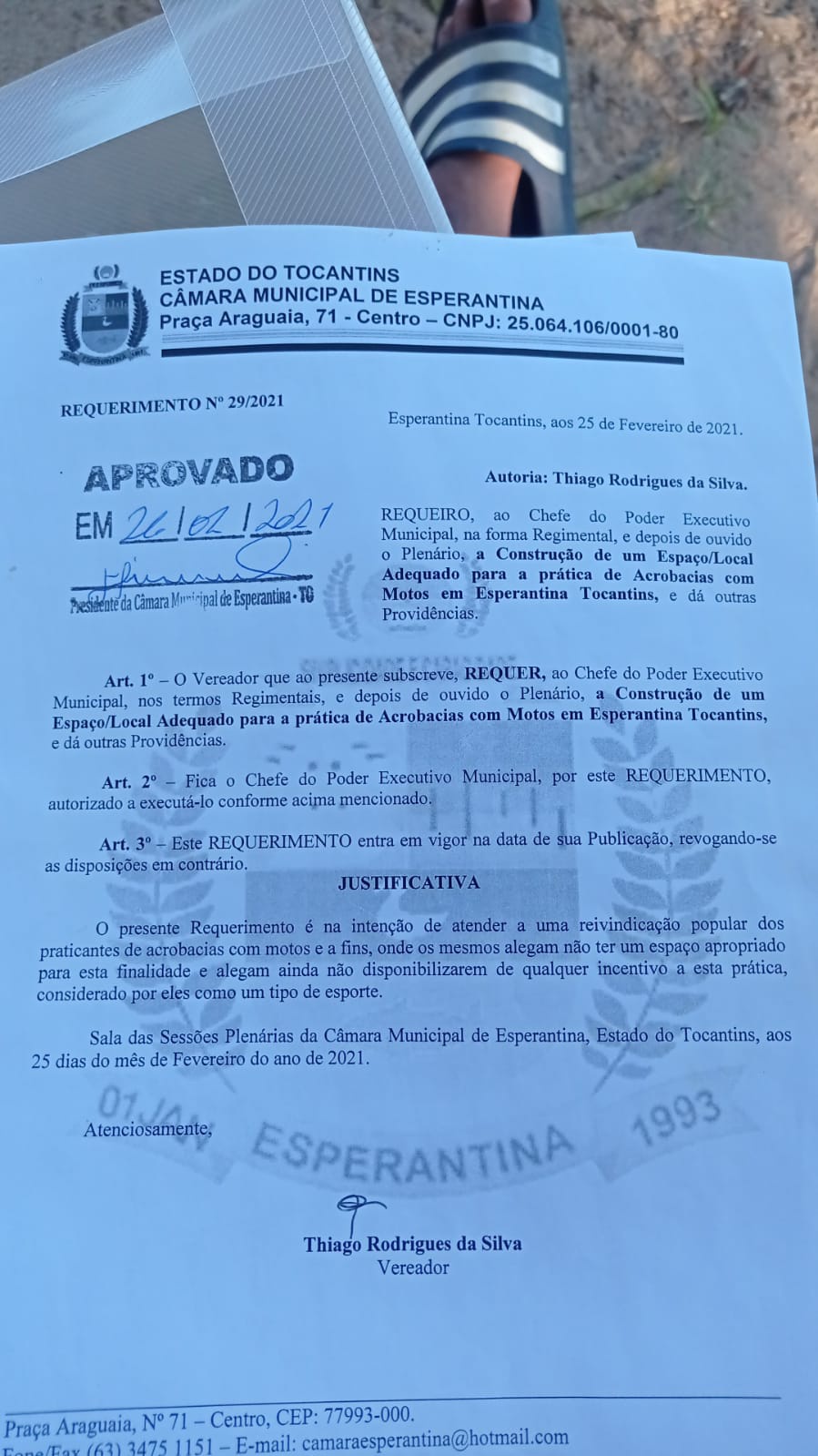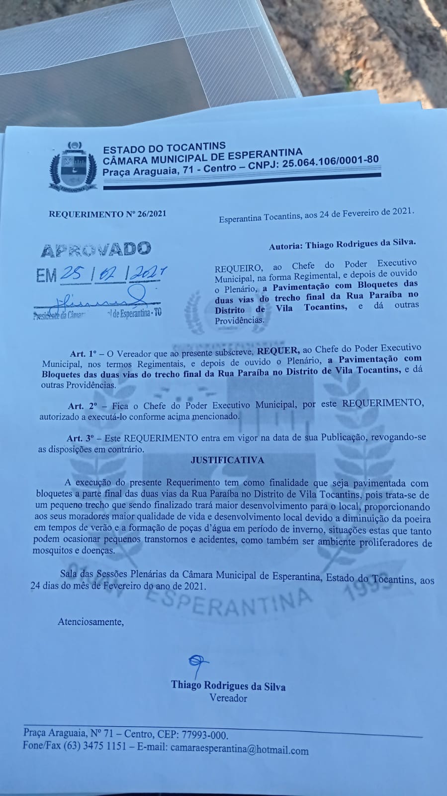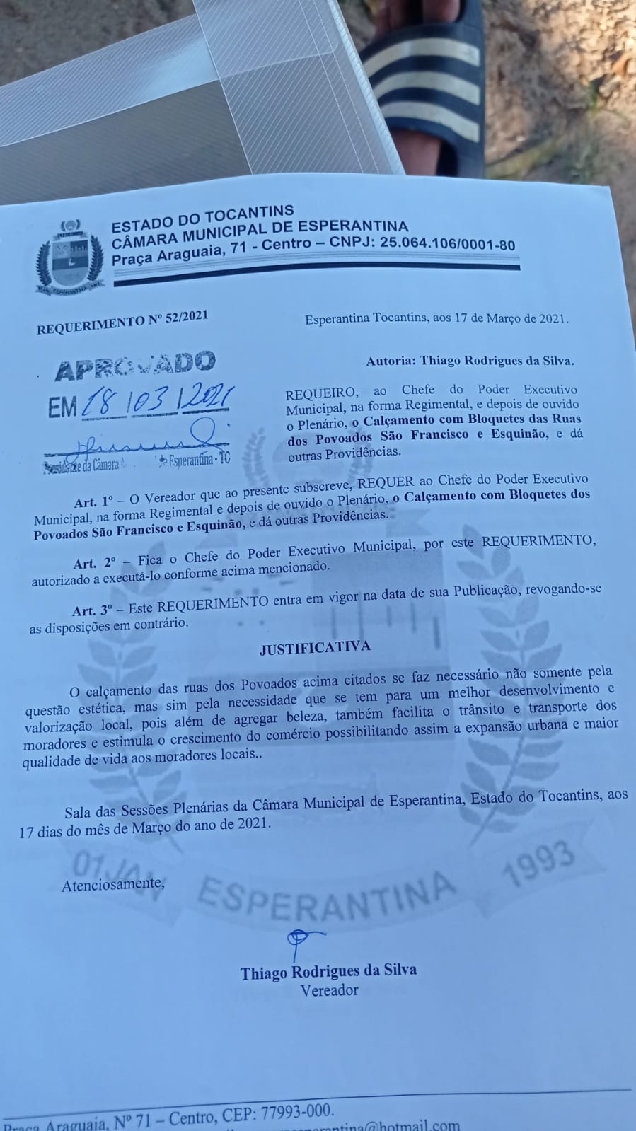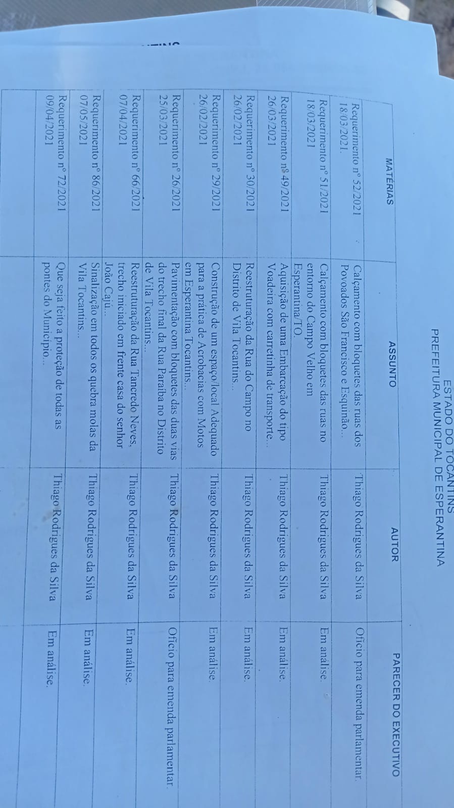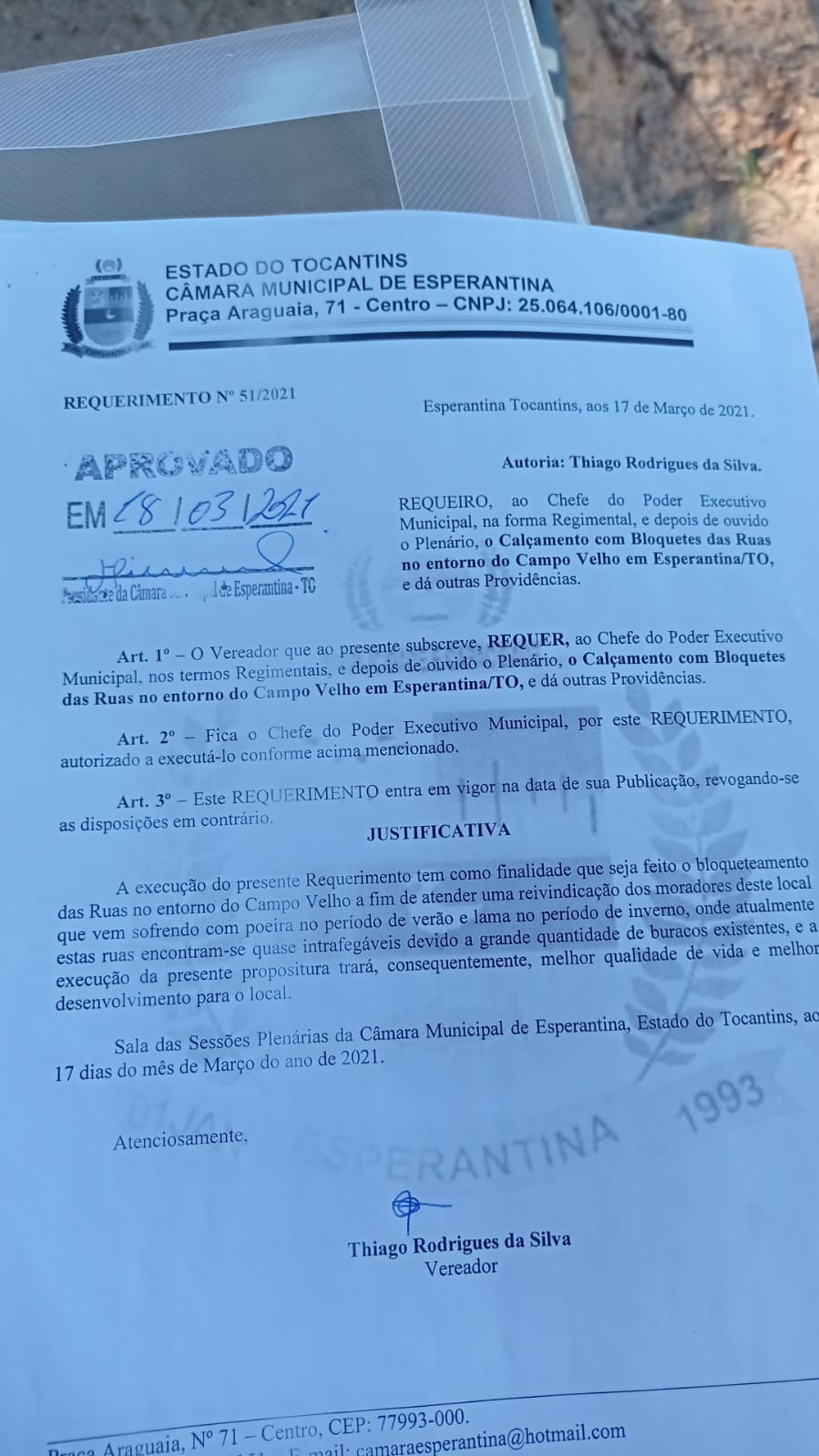 Esses são os principais projetos representado pelo vereador Thiago Rodrigues que preocupado com o bem-estar da sociedade fez estes projetos e encaminhou a câmara do legislativo de um município para quê fosse realizado as melhorias na região de Esperantina Vila Tocantins São Francisco dentre outros confira as imagens do requerimento apresentado dentro do poder legislativo e encaminhada a excelência prefeito em exercício Dr Armando