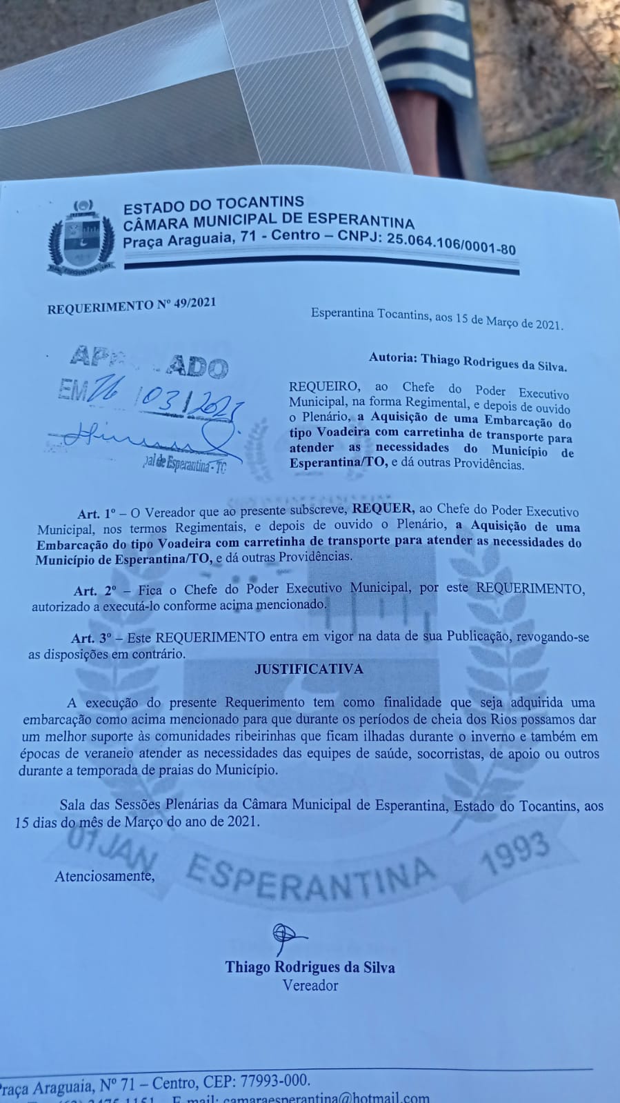 O parlamentar tem se preocupado muito com o bem-estar da sociedade e dentro disso De acordo com a necessidade da comunidade fez um projeto de lei e encaminhou para a prefeitura dentre outros projetos pedindo uma voadeira dentre também uma carretinha esses materiais é para atender as necessidades da população nós sabemos que nesse ano ocorreu uma grande cheia no município de Esperantina e por falta de embarcação as pessoas também ficaram meio que diz assistido e como essa preocupação o vereador Thiago Rodrigues fez essa solicitação